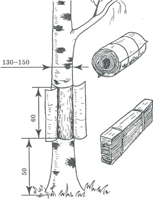 Um dünne Platten aus Birkenrinde ernten zu können, wird ein nicht all zu tiefer und vertikaler Schnitt von etwa 1,0 bis 1,5m in die Rinde gemacht. Anschließend wird die Rinde am Anfang und am Ende des vertikalen Schnitts um ca. 20 cm angeschnitten. Um die frische Birkenrinde dann behutsam vom Baum ziehen zu können ergreift der Handwerker das untere Ende des Anschnitts. Wenn der Baum und der Zeitpunkt richtig gewählt worden ist, löst sich die Rinde mit einem saftigen und klangvollen knacken.