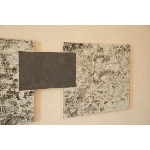 Die Collage Birke’n Schiefer ist auf hochwertigem Birken-Multiplex fixiert. Die Elemente überlappen sich und sind stabil miteinander verschraubt. Alles hängt auf 3 gedübelten Hacken. Die Oberflächen sind naturbelassen.