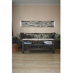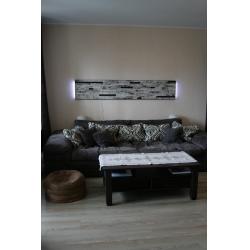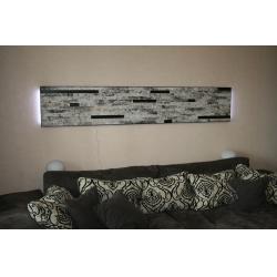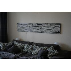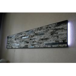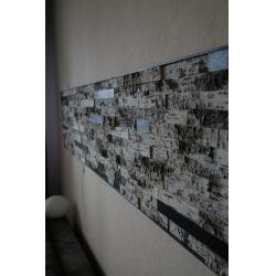 Wir haben was für die Wand gebraucht… Gebraucht, getan. Yana meisterte dieses Bild zusammen. Die Collage Birkenleder besteht aus einzelnen Birkenrindestreifen, angeordnet in verschiedenen Höhen, durchbrochen von Lederstreifen und umrahmt von geschmiedeten Eisen und weißem LED-Licht. Bilder entstanden bei Tageslicht.
