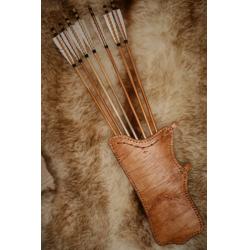 Die Flechtung, die Schlaufen und die Köcherwände sind komplett aus Birkenrinde. Yana hat für die Konstruktion 2 Rindeplatten miteinander verklebt, in Form geschnitten und dann mit teilweise abgekochten Birkenrindebändern verflochten.