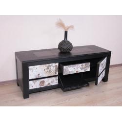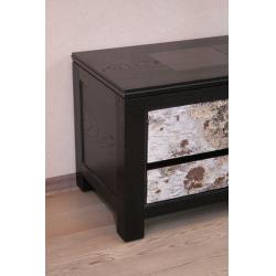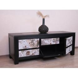 … verfeinert mit Birkenrinde und hochwertigem Leder. Das Ganze ist eingerahmt in geschmiedetes Eisen. Das Sideboard musste 2 Eigenschaften haben. Eine Sitzmöglichkeit und ein schönes Sideboard für den Fernseher. Die Schubladen sind verzinkt und deren Führungen sind aufwendig aus dem Holz des Sideboards selber ausgearbeitet.