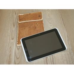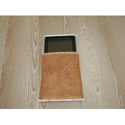 Die Tablet-Tasche hat einen modernen Kern aus Leder und flauschiger Inneneinlage. Die Rinde ist dünn gespalten und per Hand mit Bast aufgenäht.
